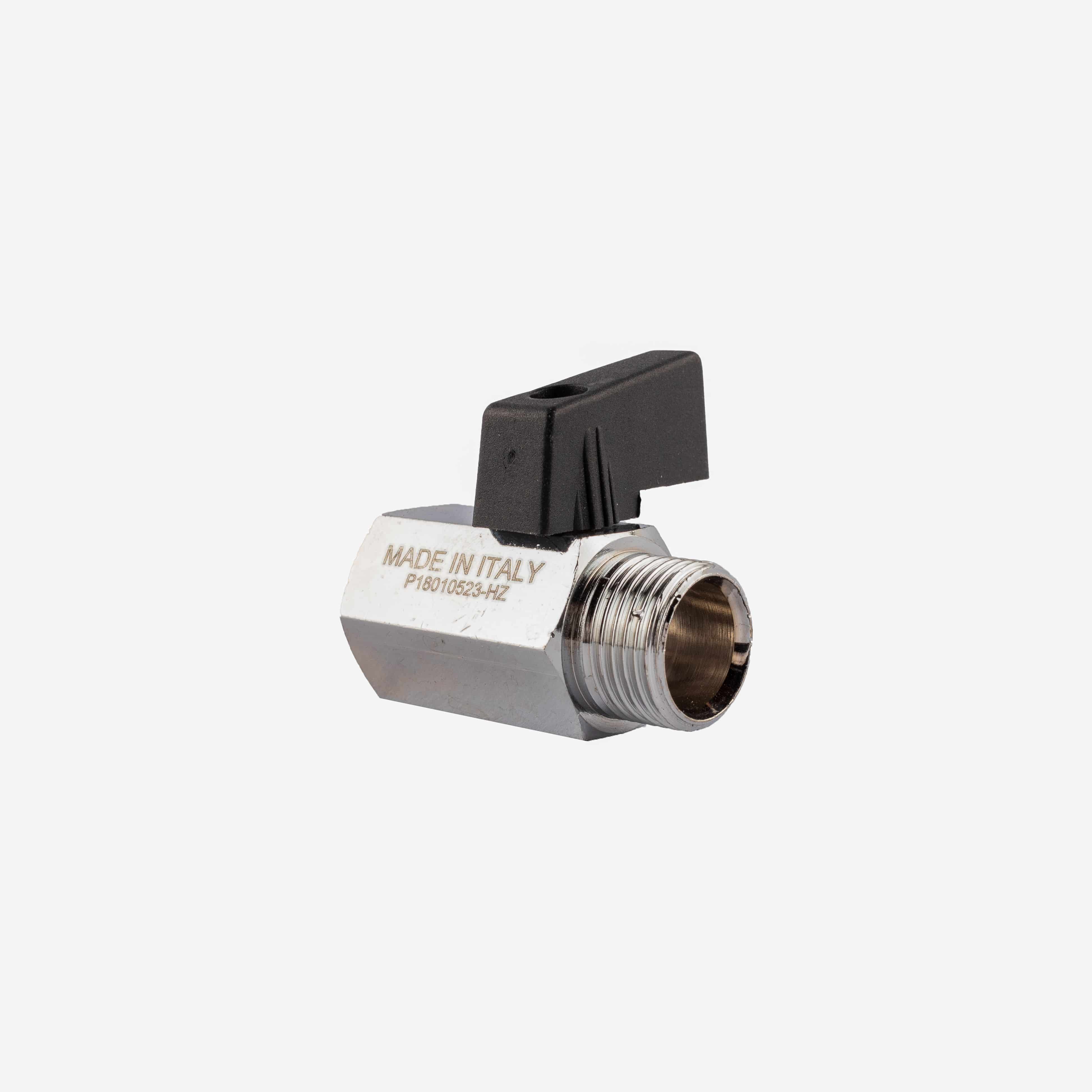 Mini-Kugelhahn mit Handgriff, zum Absperren von Druckluft- oder Flüssigkeitsströmen in Rohr- oder Schlauchleitungssystemen. Der Absperrhahn hat einerseits ein Innengewinde und andererseits ein Außengewinde – beide 3/8" BSP.