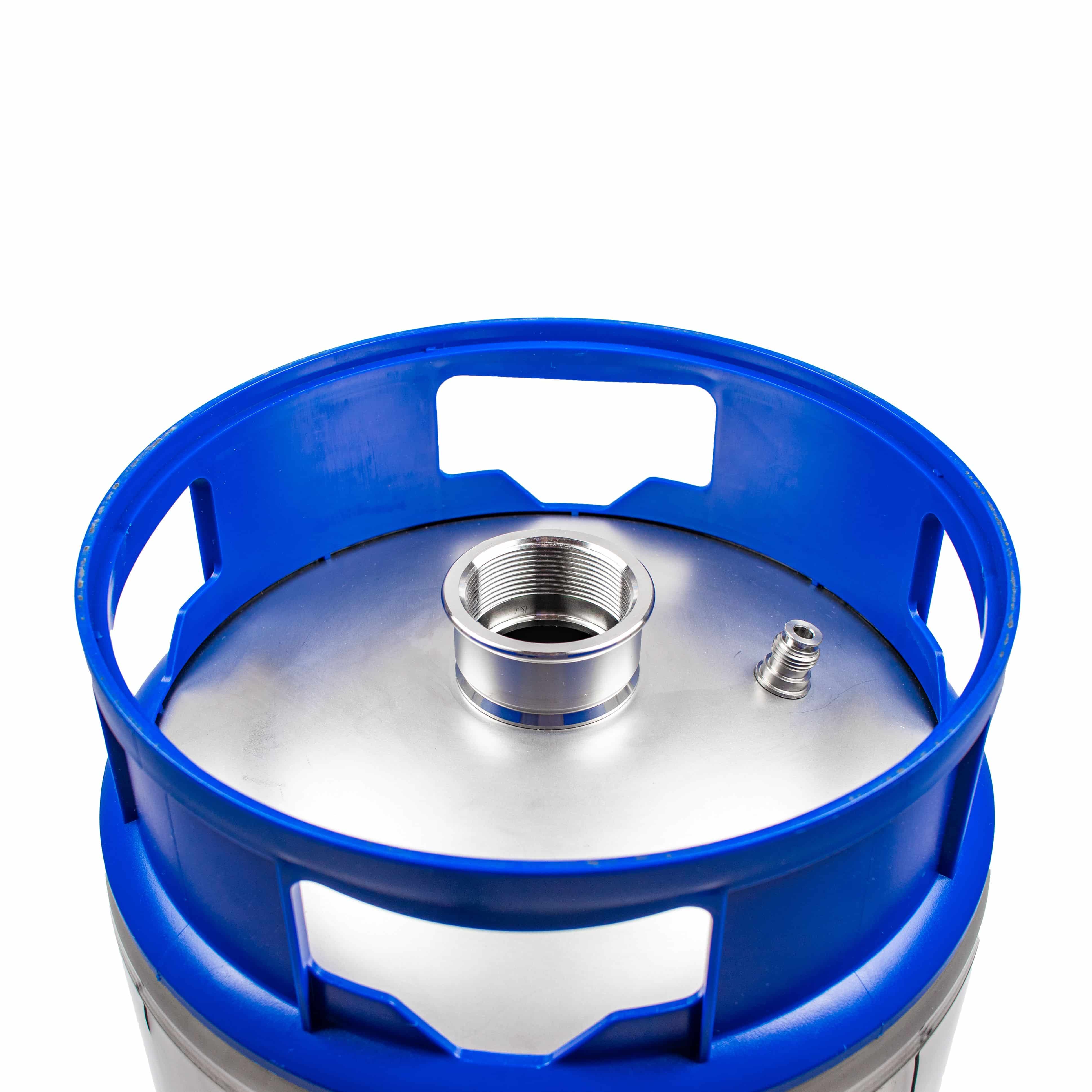Ebenfalls am Tankkopf befindet sich ein 9/16-18 UNF-Gewinde, auf das ein CO2 Ventil (NC) geschraubt werden kann. Auf dieses NC-Ventil (bitte separat bestellen) könntest du z.B. eine CO2 Kupplung (NC) mit Spundapparat aufstecken.
