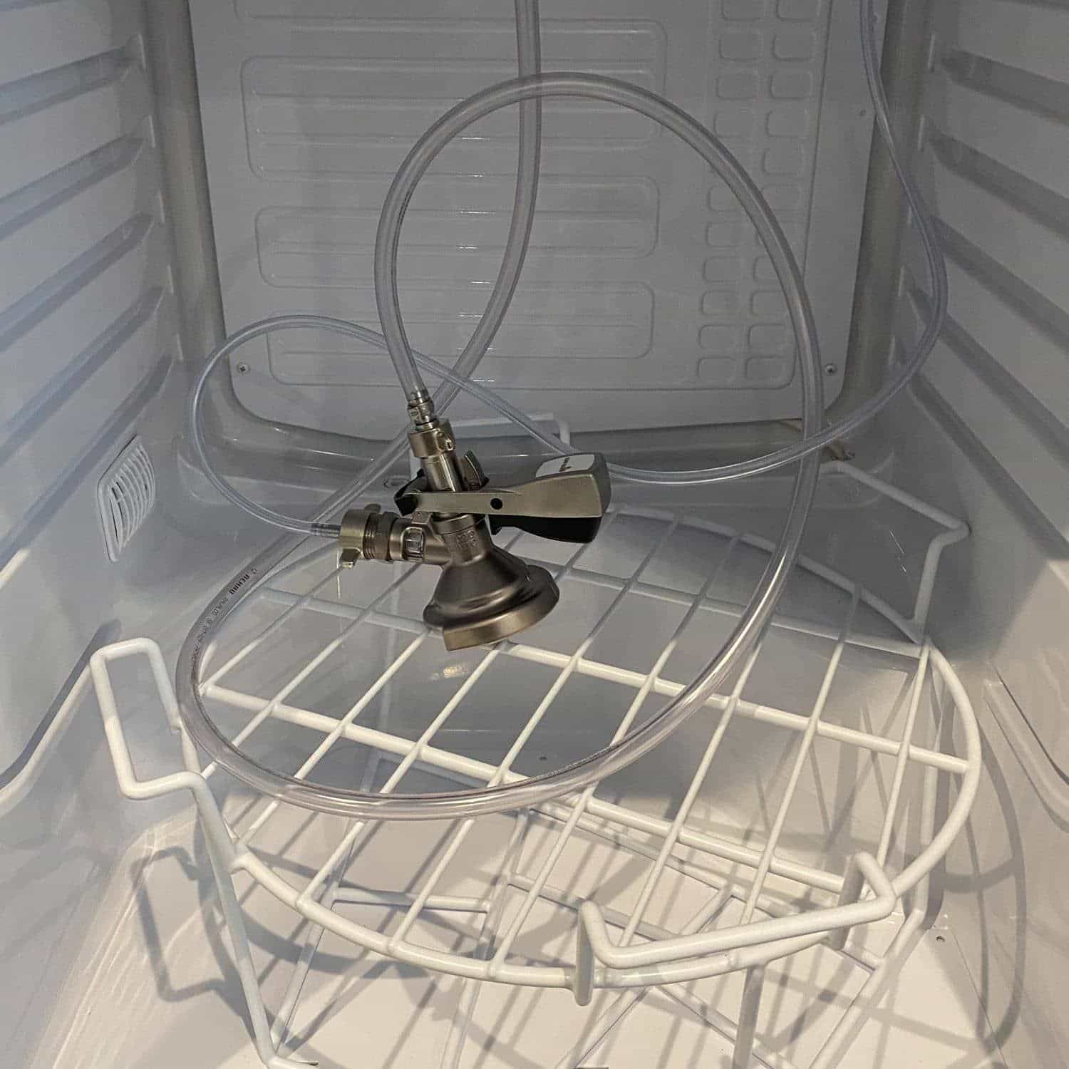 Die Ohrklemme über den Schlauch schieben, den Schlauch auf die Bierleitung schieben, Ohrkemme festzwicken. - Den 4x8mm-CO2 Schlauch durch das Loch in der Kühlschrankrückseite führen.