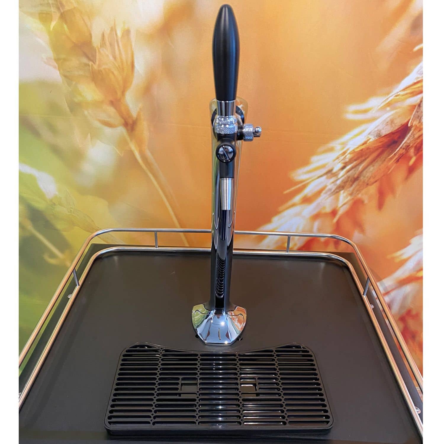 Diese Kühlschrank Zapfanlage überzeugt durch die Zusammenstellung von hochwertigen, praktischen Materialen und Zubehör. Aus dem Kühlgerät ragt eine elegante Schwanenhals-Schanksäule in verchromter Optik. Der Kühlschrank hat keine Glastür, sondern eine matt-silbergraue Front mit abgerundeten Seitenkanten. Eine Chrom-Reling verläuft hinten und seitlich an der schwarzen Kühlschrank-Oberfläche entlang. Sie unterstützt nicht nur das ansprechende Aussehen der Zapfanlage, sondern sichert gleichwohl darauf abgestellte Biergläser vor dem Abrutschen. Die mitgelieferte schwarze Kunststoff-Tropfschale passt zum Gesamtdesign und sorgt für eine saubere Arbeitsfläche während des Ausschanks. Der matt-schwarze Kompensatorhahn Rubinetto, mit dem der Bierfluss regelbar ist, rundet das edle Erscheinungsbild ab.