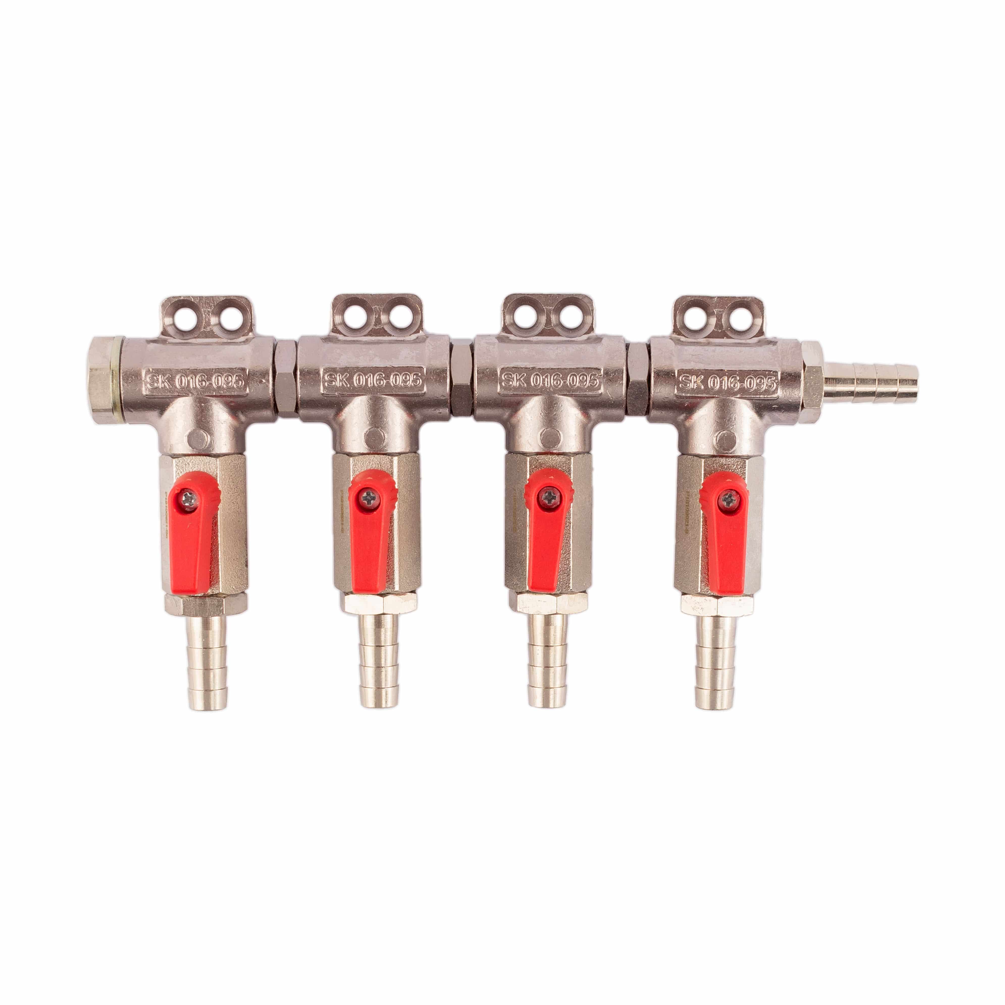 4-leitiger Gasverteiler für Niederdruck 0-10 bar links blind, mit fünf Tüllen für Schläuche mit 7 mm Innendurchmesser. 5mm-Bohrungen für Wandmontage des Micro Matic CO2 Gasverteilers sind vorhanden.