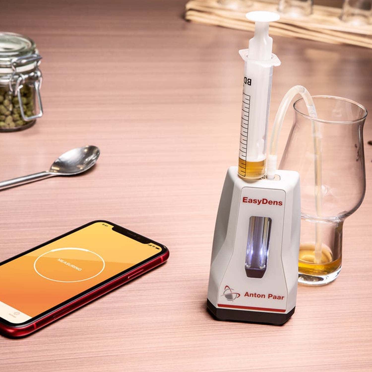 Das EasyDens von Anton Paar ist ein Messgerät zur Bestimmung der Dichte und Konzentration von Flüssigkeiten. Das digitale Hydrometer sendet die gemessenen Werte per Bluetooth in Sekundenschnelle an die zugehörige App auf deinem Smartphone. Das EasyDens Messgerät funktioniert nach dem Biegeschwinger Prinzip.