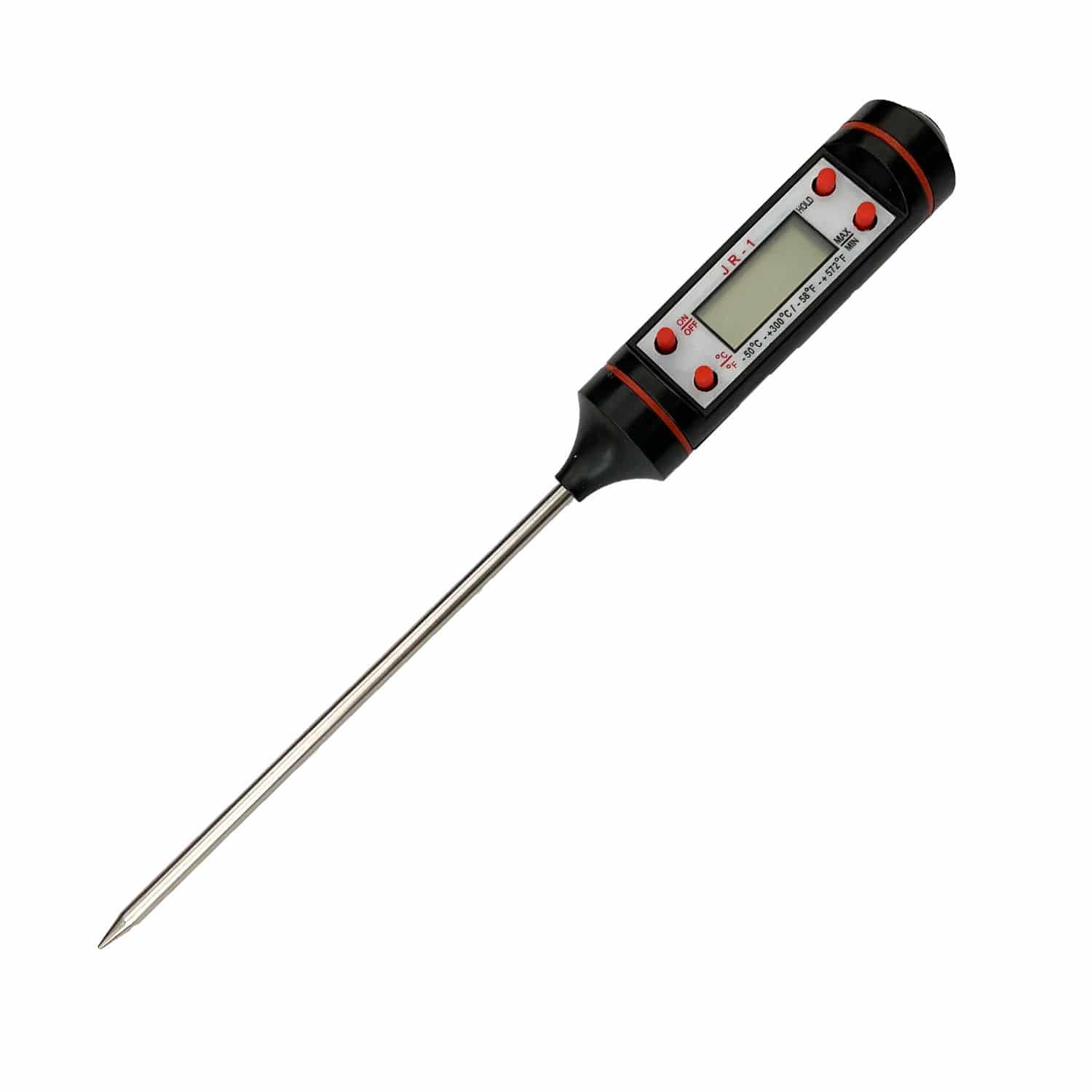 Universal einsetzbares Thermometer mit digitaler Anzeige der Temperatur in Grad Celsius und in Grad Fahrenheit. Die Temperatur wird mit einer Nachkommastelle angezeigt. Der Temperaturfühler besteht aus Edelstahl und misst im Bereich von -50° C bis +300° C bzw. -58° F bis +572° F. Das Thermometer schaltet sich nach 10 Minuten Nichtgebrauch automatisch ab. Betrieben wird das Digitalthermometer mit einer 1,5 V Knopfzelle, die im Lieferumfang enthalten ist. Ebenfalls dabei ist eine Kunststoff-Schutzhülse für den Temperaturfühler.