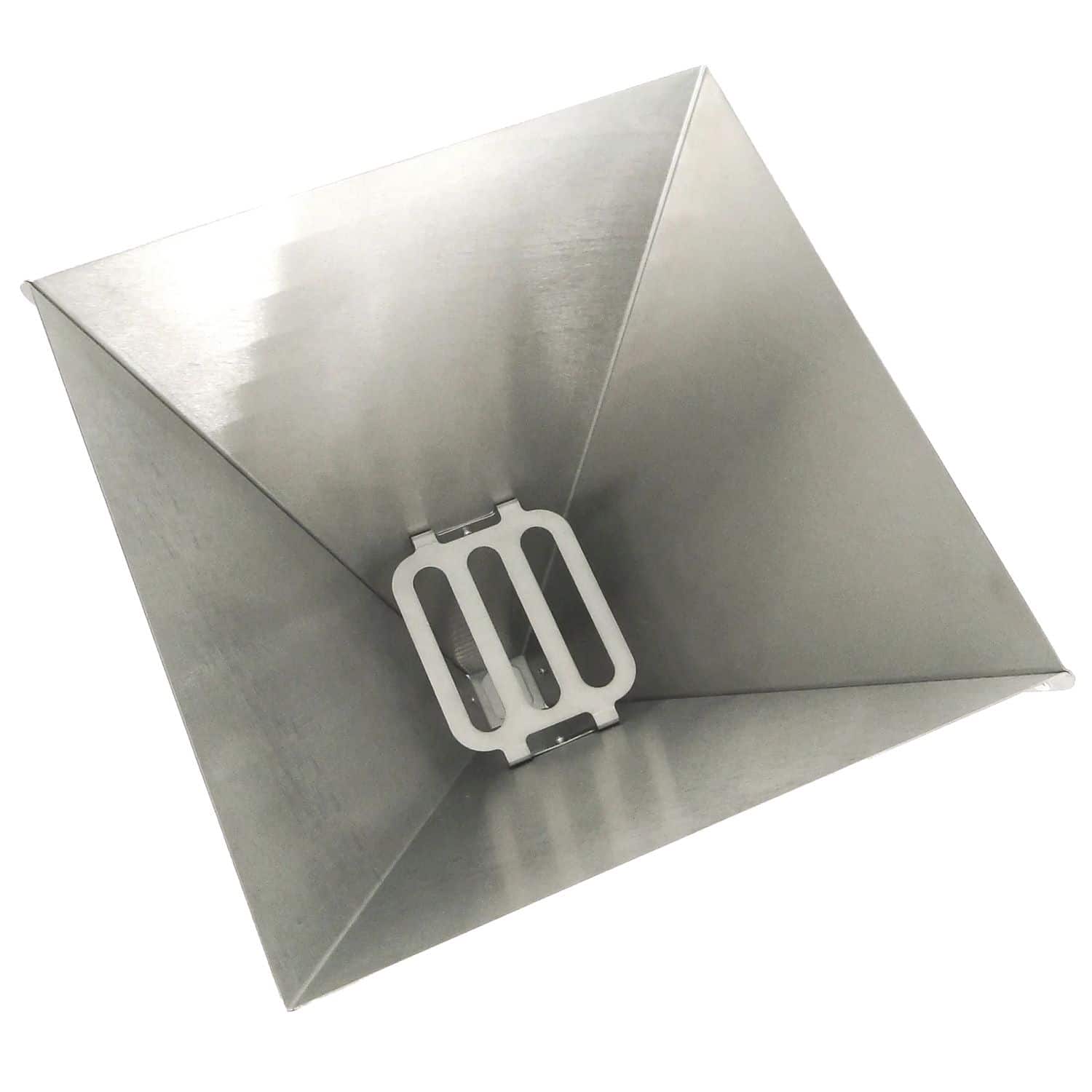 In seinem Inneren ist der Trichter mit einem Eingriffschutzgitter ausgestattet. Die beiden Trichtersegmente und der Eingriffschutz lassen sich bequem zusammenschrauben (Schrauben + Muttern liegen bei). Alternativ kannst du zum Zusammenbau des Trichters die ebenfalls beigefügten Blindnieten benutzen, falls du eine entsprechende Blindnietenzange hast.