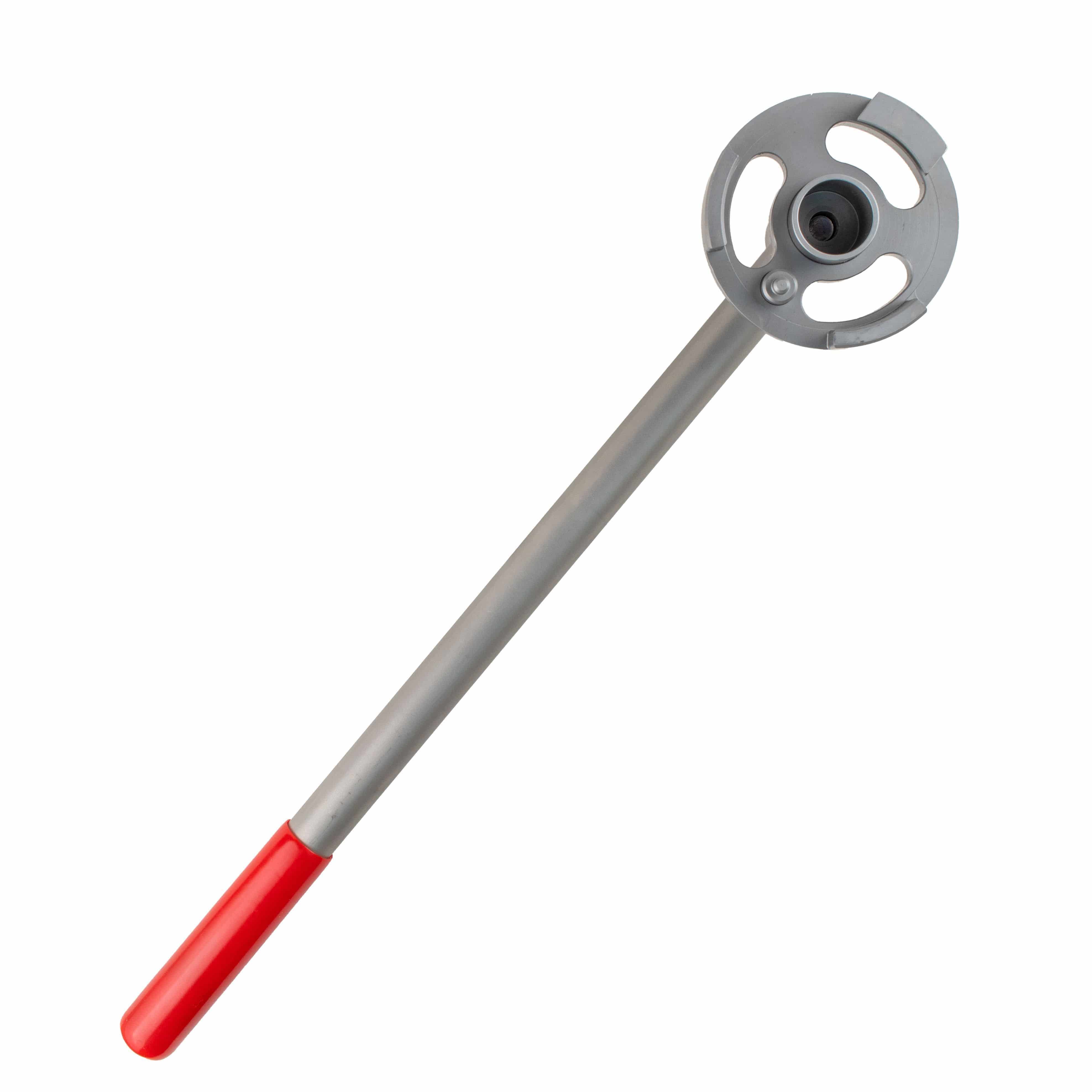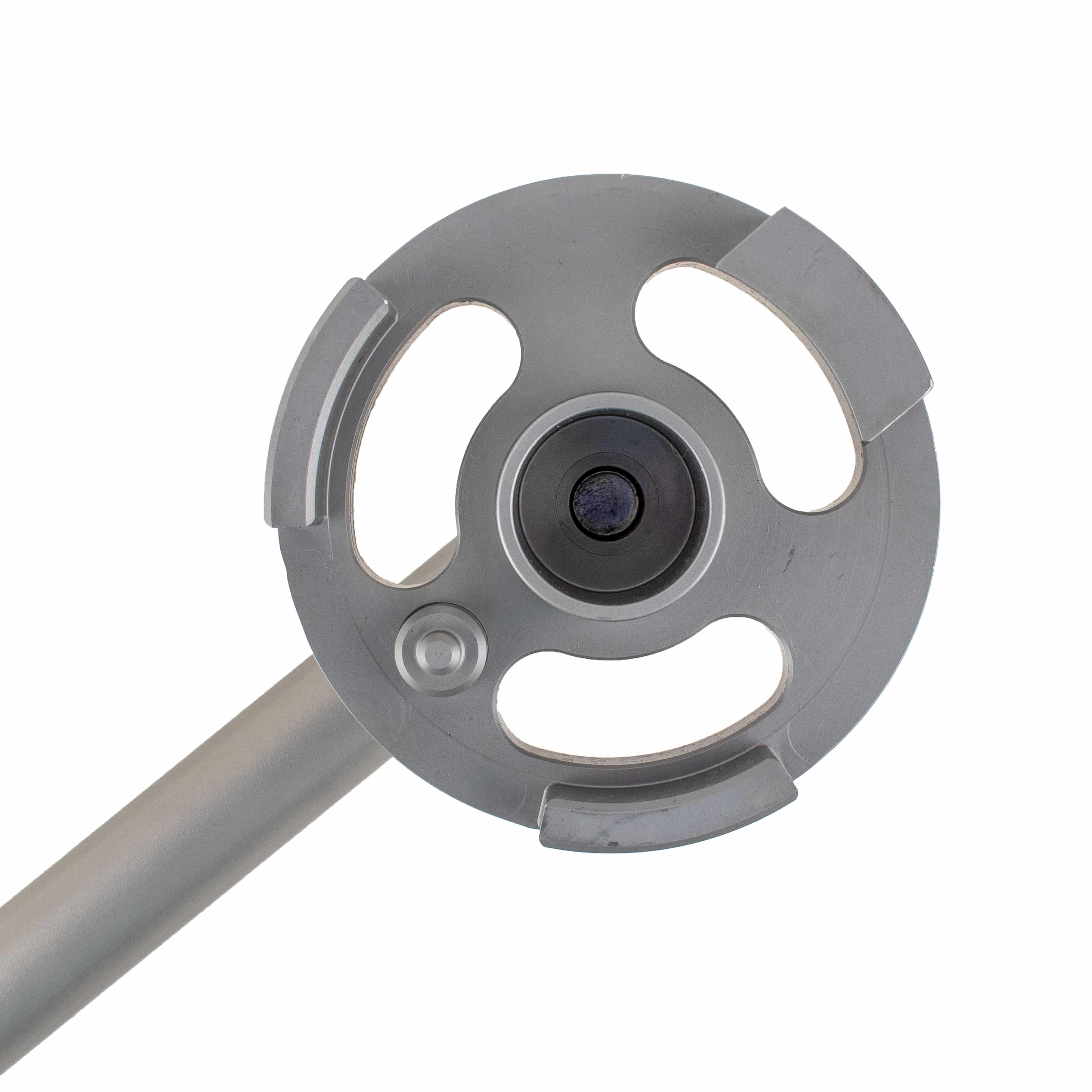 Dazu bringst du das Werkzeug auf dem Fitting-Flansch an und drückst den Griff nach unten. Achte dabei darauf, dass der Dorn des Entlüfters sich in das Nieten-Loch einpasst. Ansonsten kann sich der Werkzeug-Griff bei Druckausübung verbiegen.