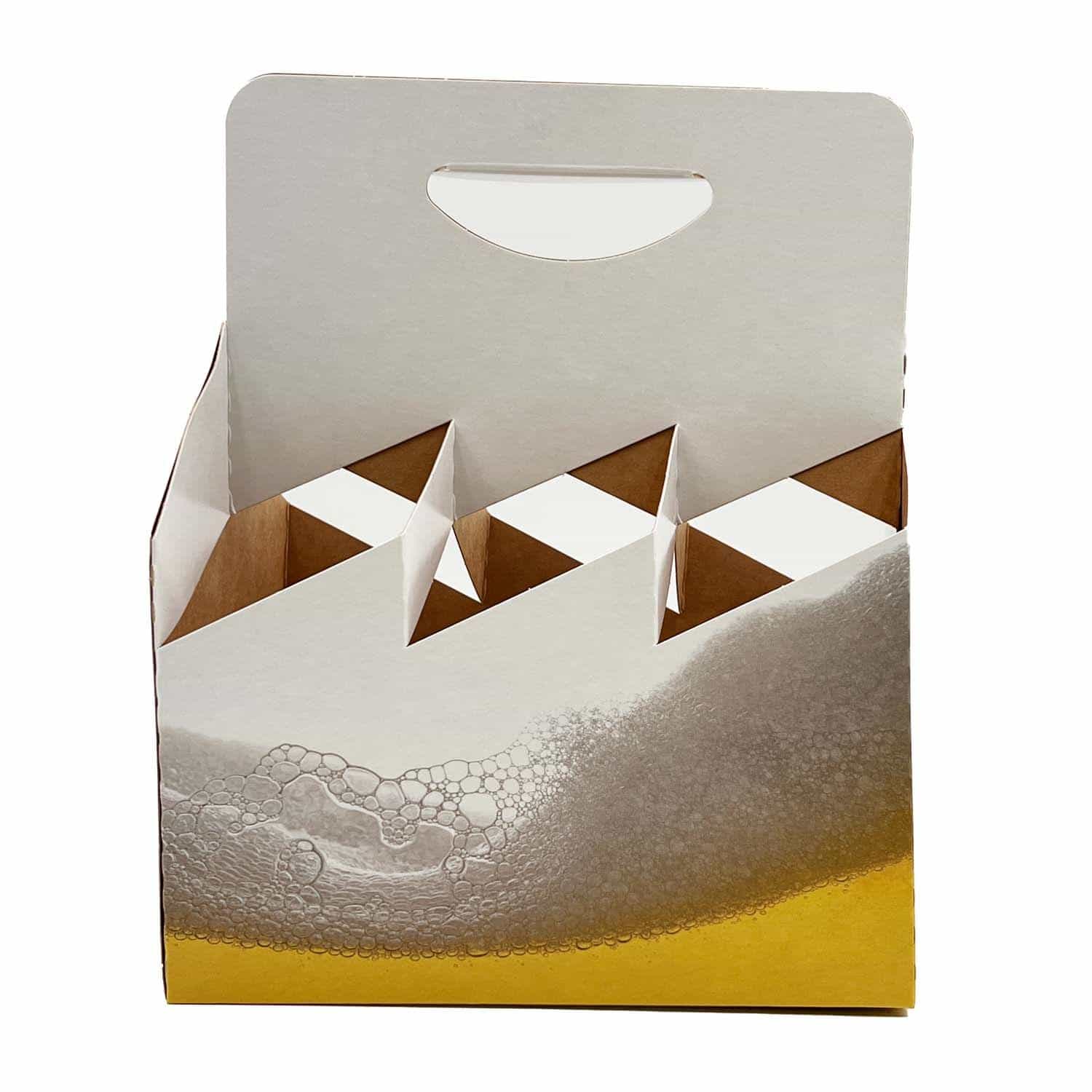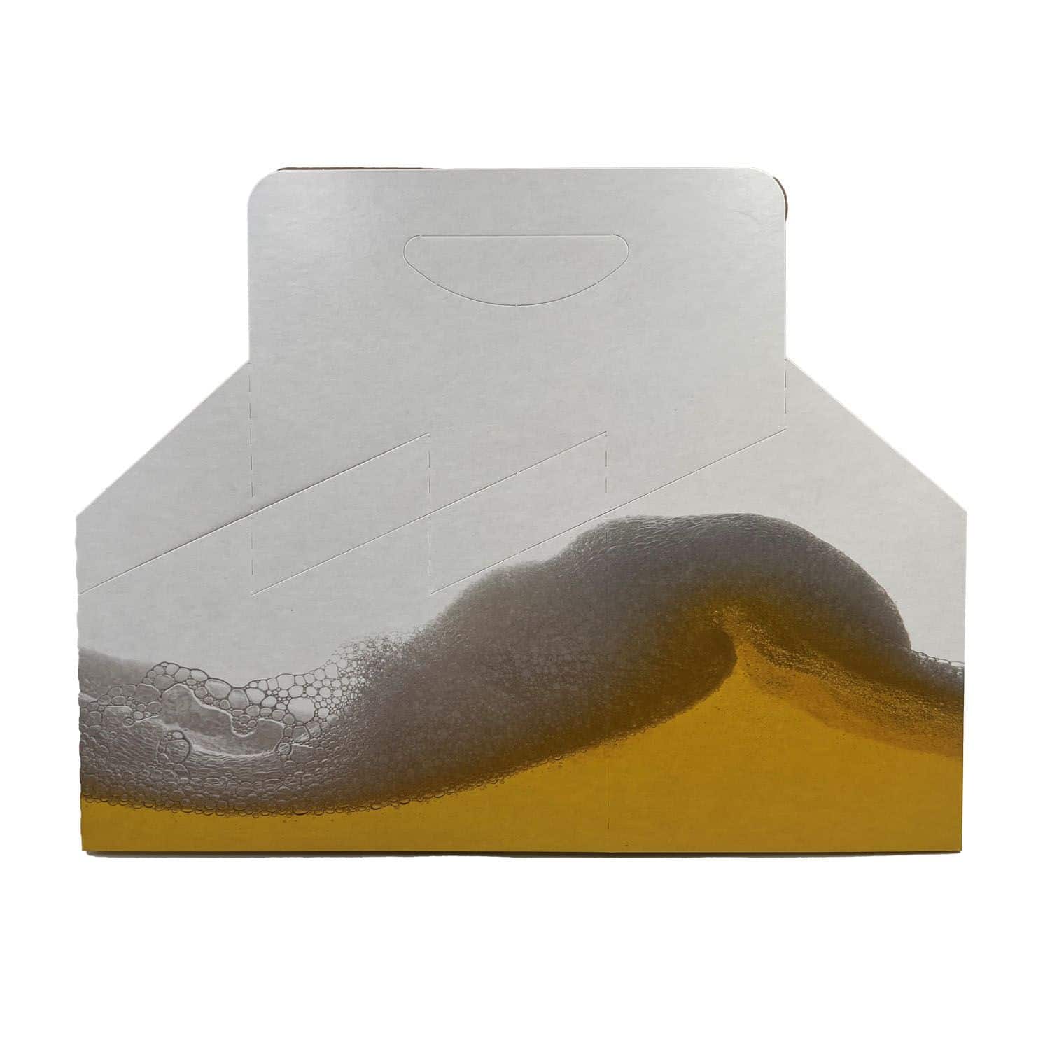 Dieses Flaschenträger-Design mach sofort Lust auf den Inhalt. Um alle Träger-Außenseiten zieht sich das Motiv einer schmackhaft, spritzig, frisch anmutenden Bierschaumkrone. Farben: Goldgelb-Weiß.