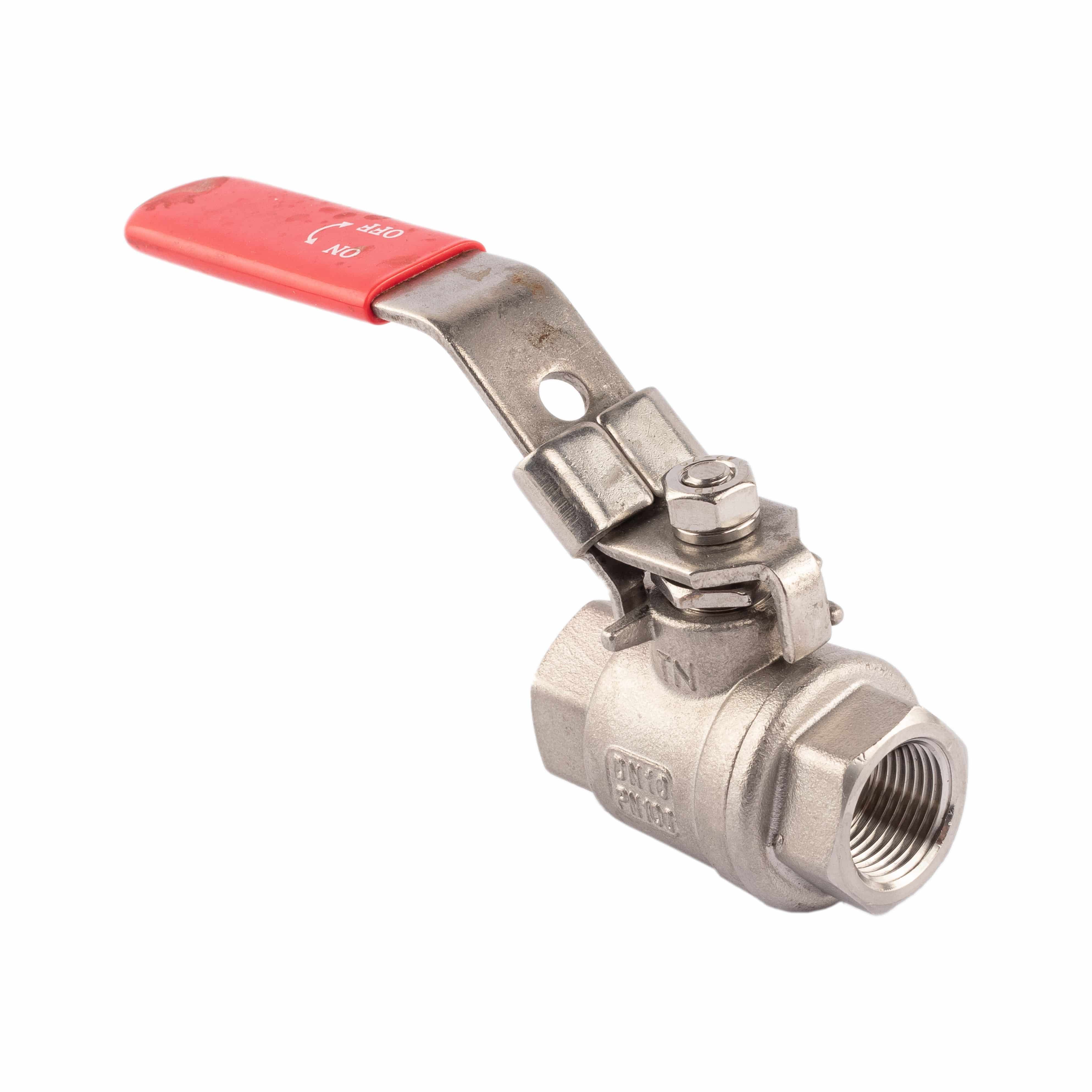 Zweiteiliger Kugelhahn aus Edelstahl, mit vollem Durchgang.