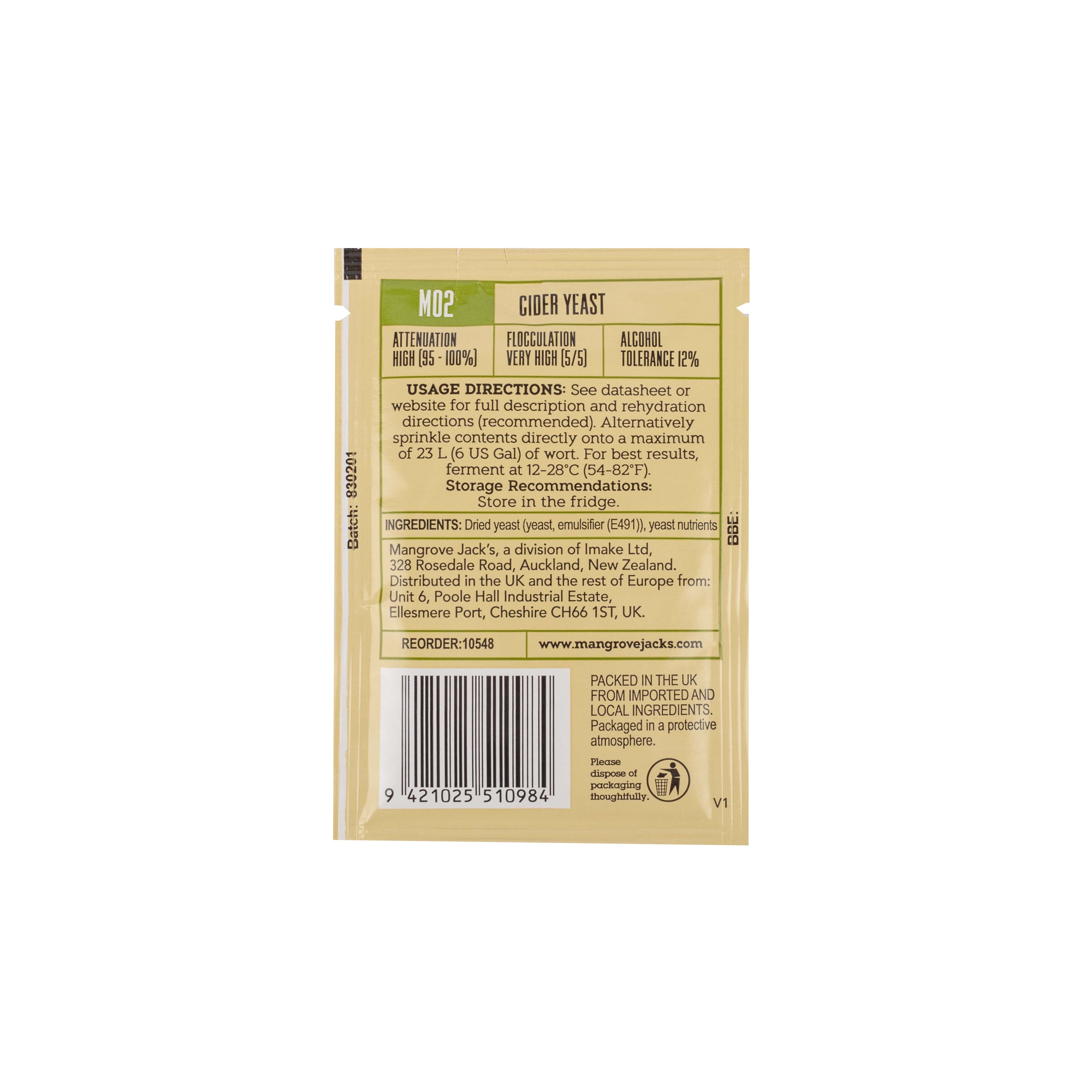 Die Mangrove Jacks M02 CIDER Trockenhefe produziert viele fruchtige Esteraromen und verleiht damit dem Apfelcider/Most einen wunderbaren Geschmack. Die M02 Cider Yeast kitzelt aus dem zu vergärenden Saft wirklich das volle Frucht-Potenzial heraus, welches letztlich dazu beiträgt, einen schmackhaften und erfrischenden Apfelwein herzustellen.