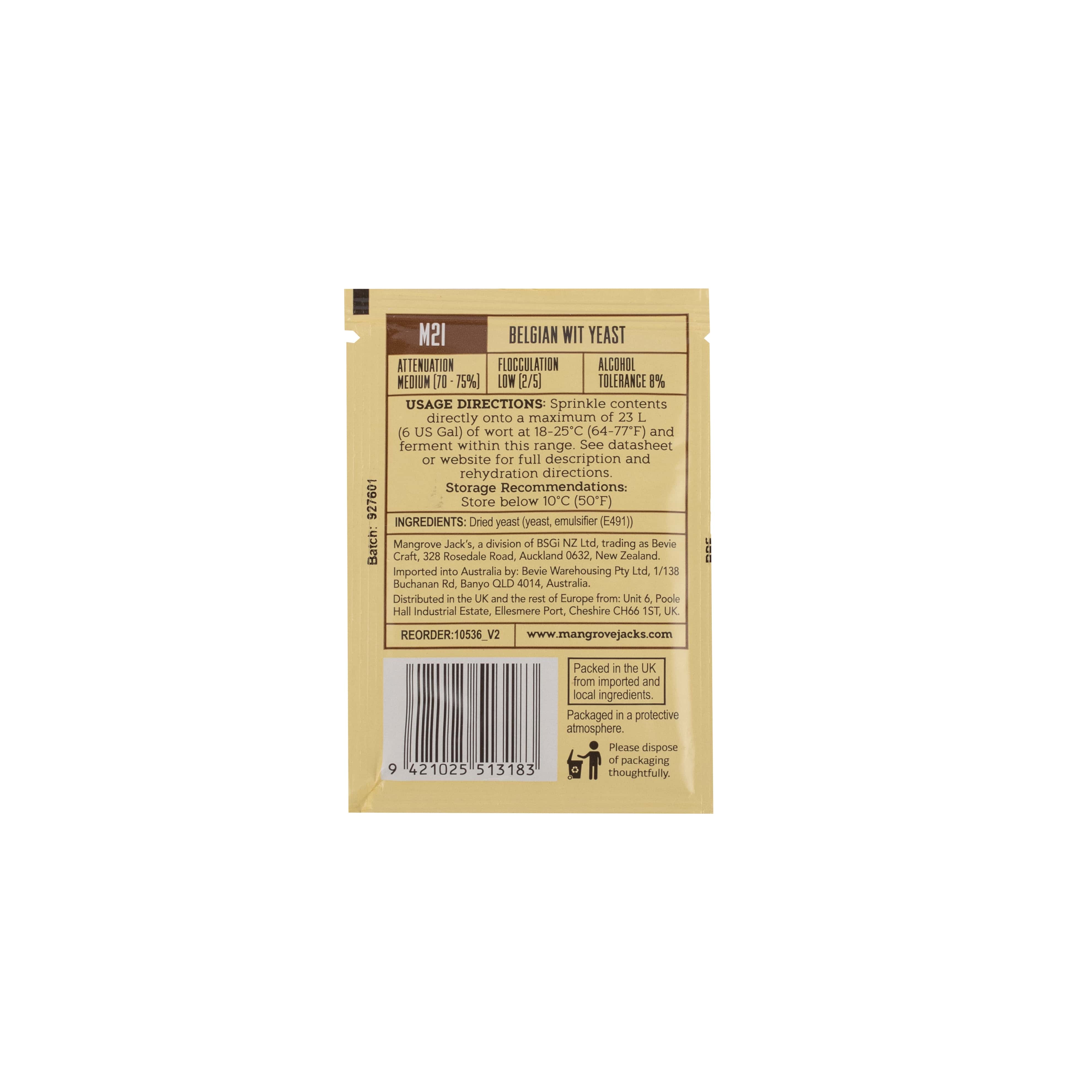 Die Mangrove Jacks M21 BELGIAN WIT Trockenhefe ist eine perfekte Hefe für traditionelle, obergärige belgische Weizenbiere, die Witbiere. M21 Belgian Wit Yeast produziert ausbalancierte fruchtig-estrige und würzige Biere und hinterlässt eine unterschwellige, leicht wahrnehmbare Süße. Bei ausreichend langer Lagerdauer des Bieres hat sie außerdem eine gute klärende Wirkung.