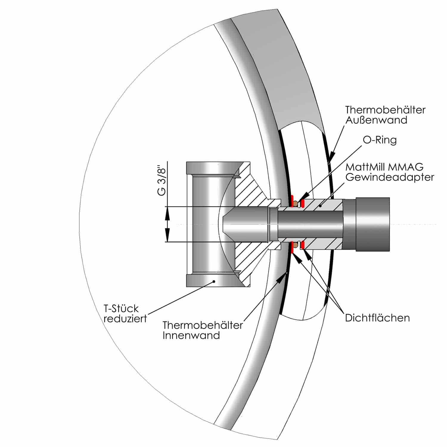 Für die Montage der MattMill Läuterhexe EKTB ist eine Durchlassbohrung für 3/8" BSP (ca. 16 mm) oder für 1/2" BSP (ca. 21 mm) in der Behälterwand erforderlich. Die Lochmitte sollte sich ca. 20 mm über dem inneren Behälterboden befinden.