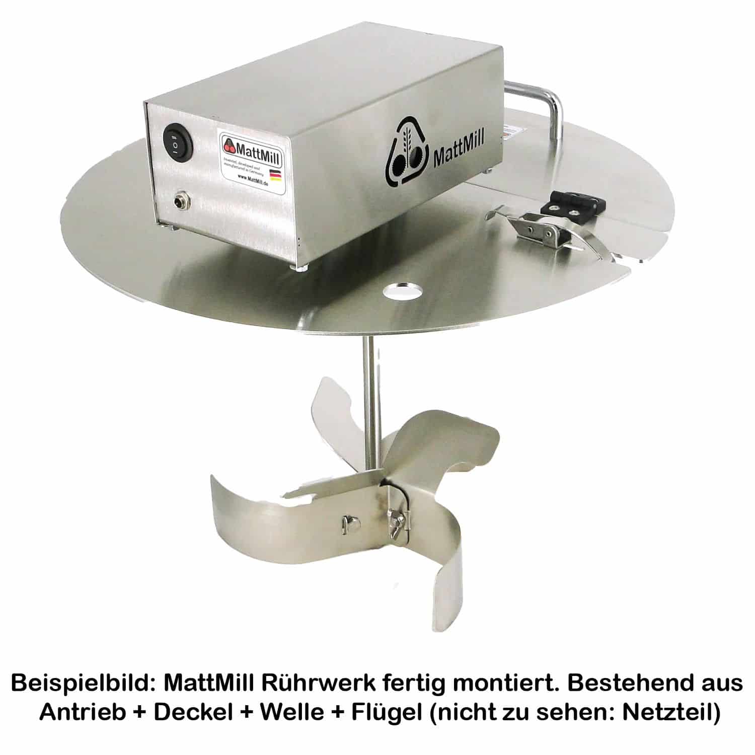- 1x MattMill Rührwerkantrieb (Edelstahlgekapselte Antriebseinheit mit eingebautem Motor, Drehzahlwahlschalter, Eingangsbuchse 12V, Edelstahl-Befestigungsschrauben)