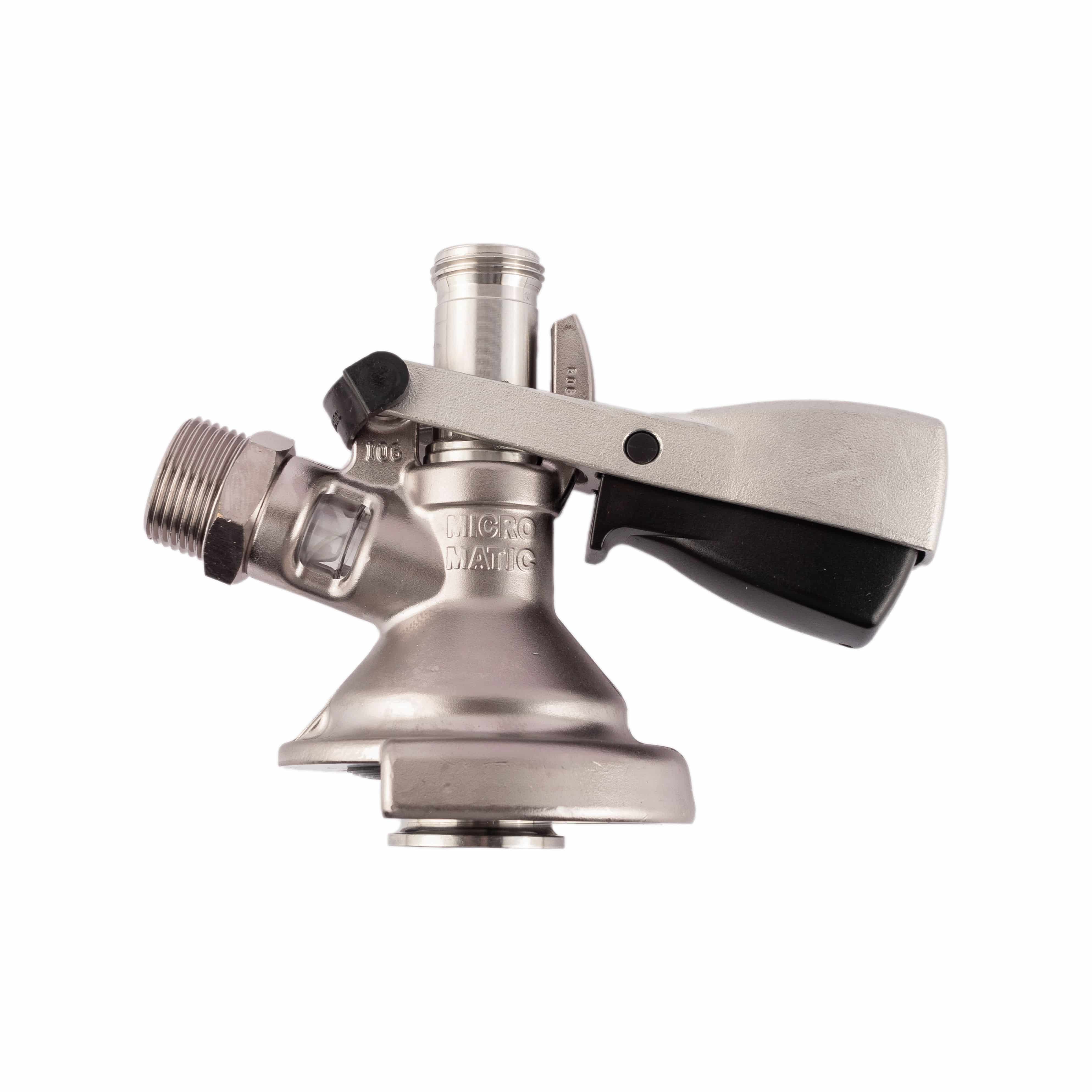 Micro Matic Flachzapfkopf aus dem A-System. Mit F1-Edelstahlgriff und Micro Matic Logo.