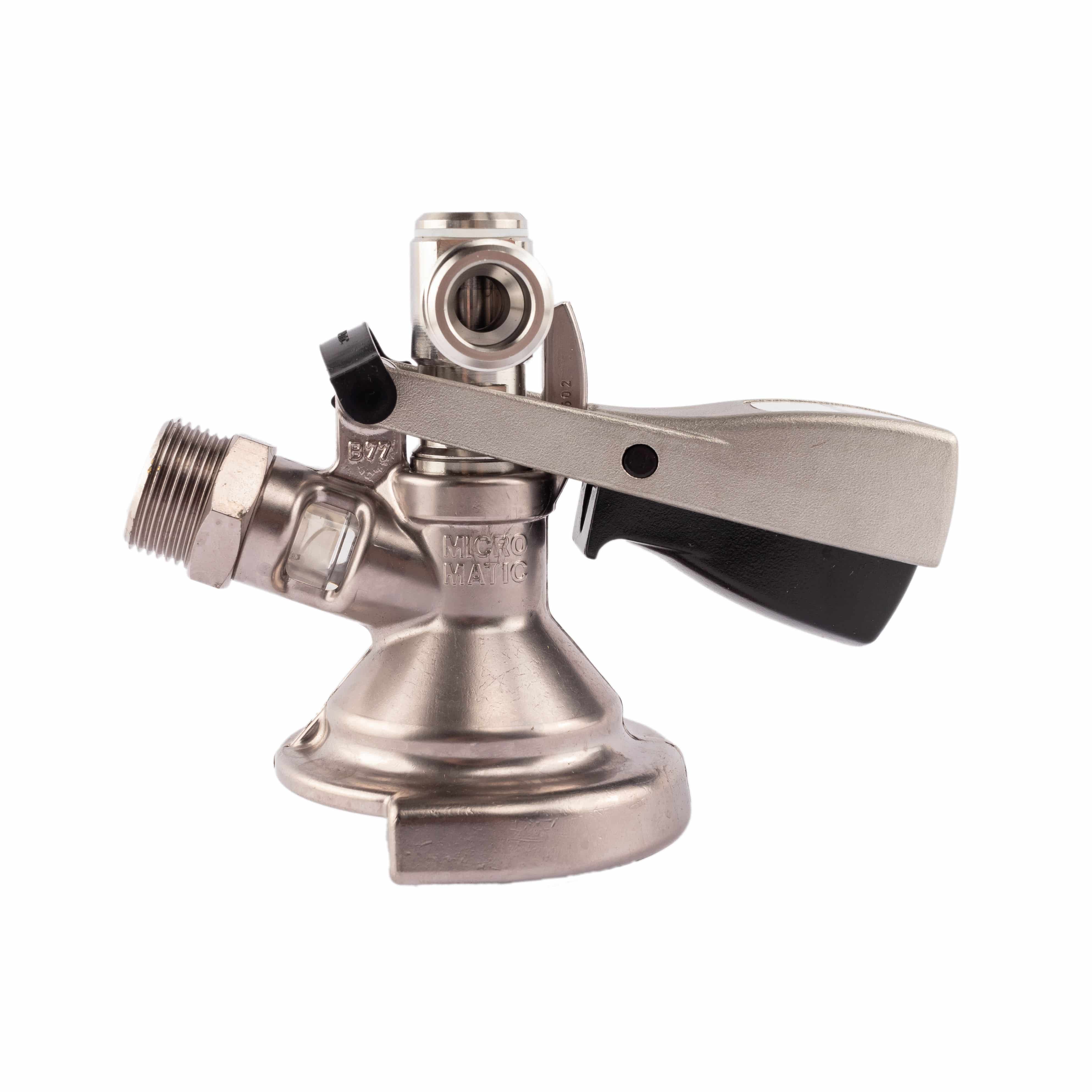 Micro Matic Flachzapfkopf aus dem A-System. Mit F1-Edelstahlgriff und Micro Matic Logo.