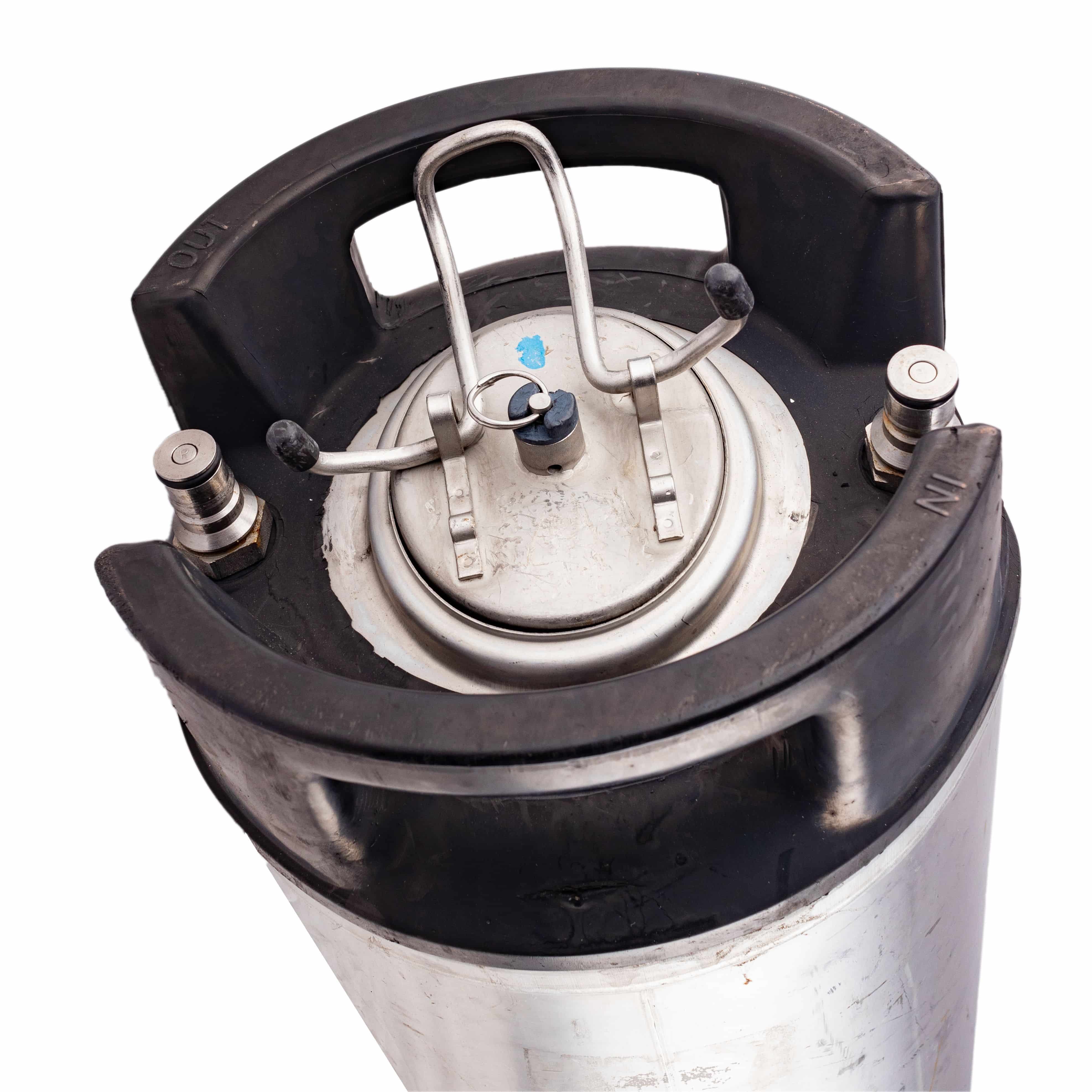 Für den stabilen Stand des gebrauchten NC-Kegs sorgt sein robuster Gummiboden. Oben hat der Behälter einen geteilten Gummring mit zwei praktischen Tragegriff-Einfassungen.
