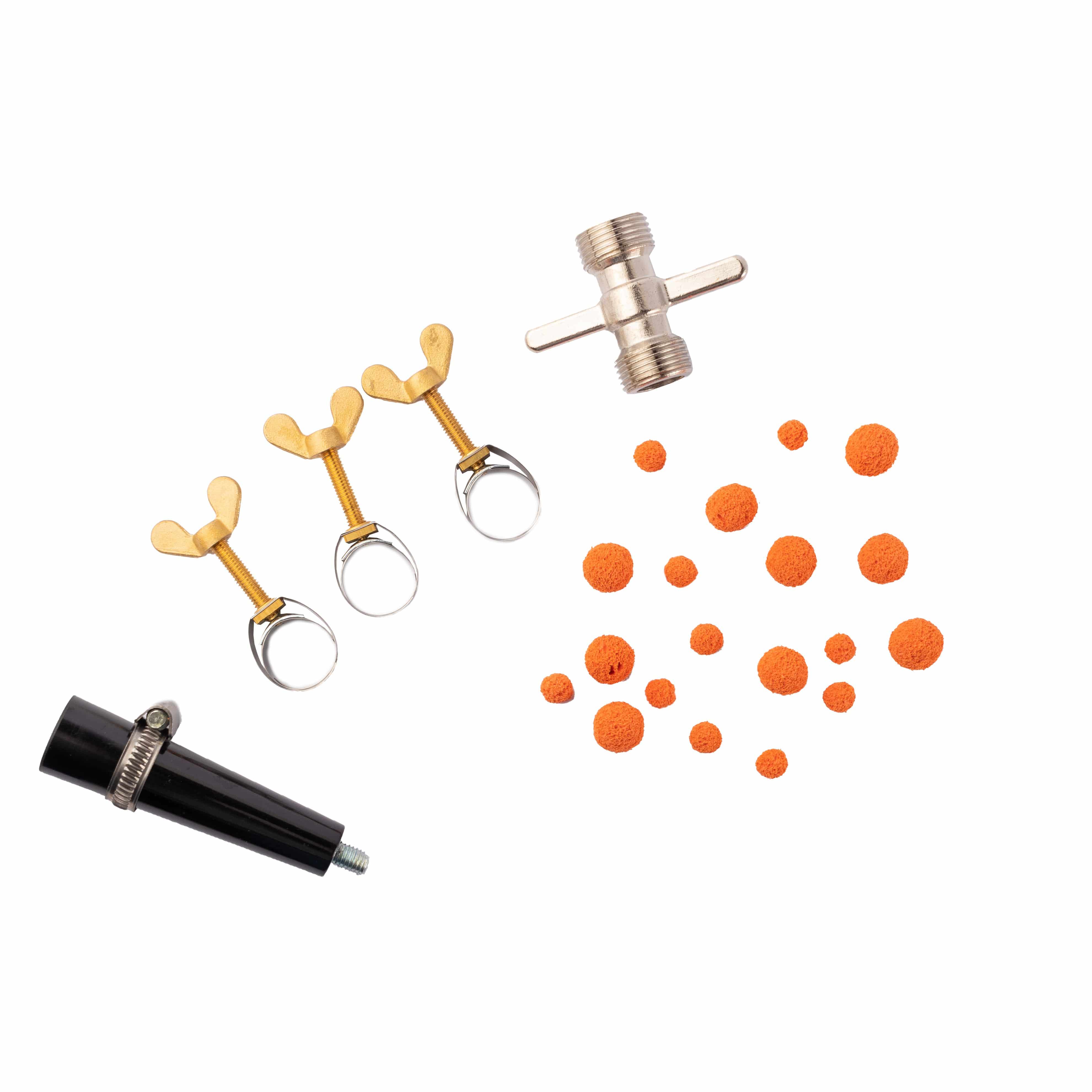 Das Set beinhaltet die zum Anschluss erforderlichen Schläuche: Zwei mal vom Schankhahnausgang zum Reinigungsgerät, einen Wasserzulauf und einen Wasserablauf. Zur Verbindung von zwei Getränkeleitungen im Bierkeller ist ein 5/8" Kellerverbindungsstück dabei. Schlauchklemmen und Schwammgummikugeln liegen ebenfalls bei.